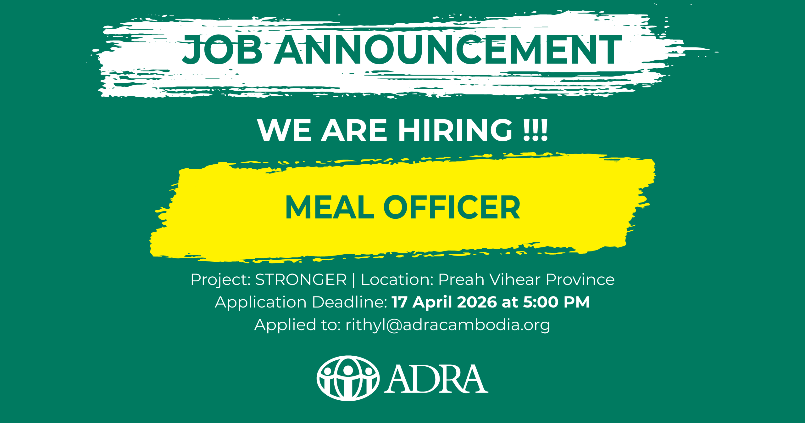 Latest News & Blog Posts Job Announcement: MEAL Officer The Adventist Development and Relief Agency (ADRA) Cambodia is looking for Cambodian national to fill the positions below: MEAL Officer<br Read More » April 7, 2026